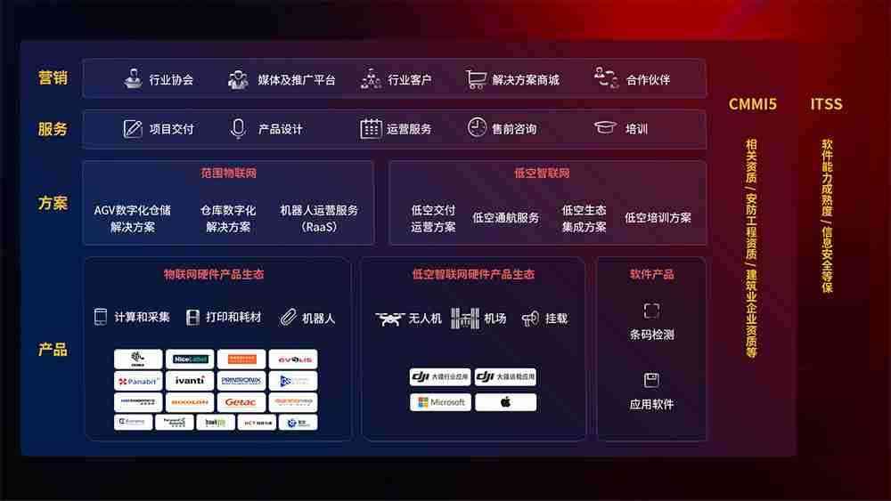 聚合国内外先进的物联网硬件产品品牌,,,聚焦数字化仓储、、、机器人运营、、低空智联网等领域,,共同打造适合客户业务场景的解决方案并提供交付服务